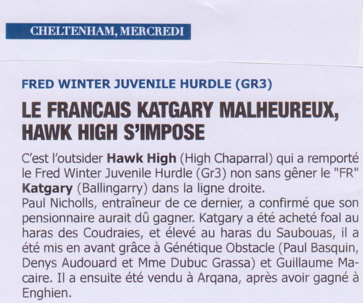 CHELTENHAM : KATGARY 2ÈME DU FRED WINTER JUVENILE HURDLE (GR3)